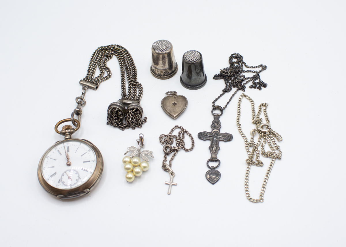 257: (13934-1) Erä hopeakoruja 19,84g (813, 900, 916, 925) br., taskukello 49,35g/800 br. + helmiriipus