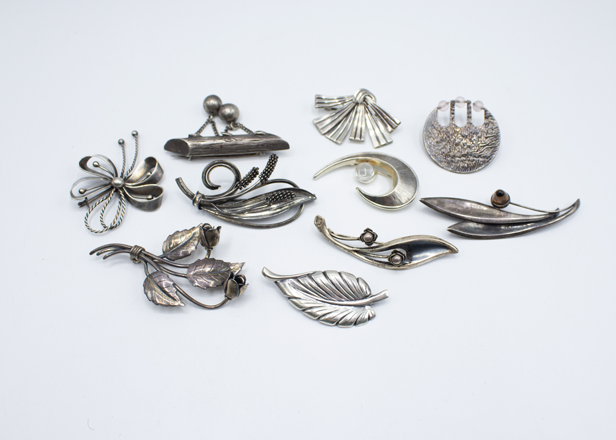 54: (13952-28) Erä hopeisia rintaneuloja 63,90g (84, 813, 916, 925) br.