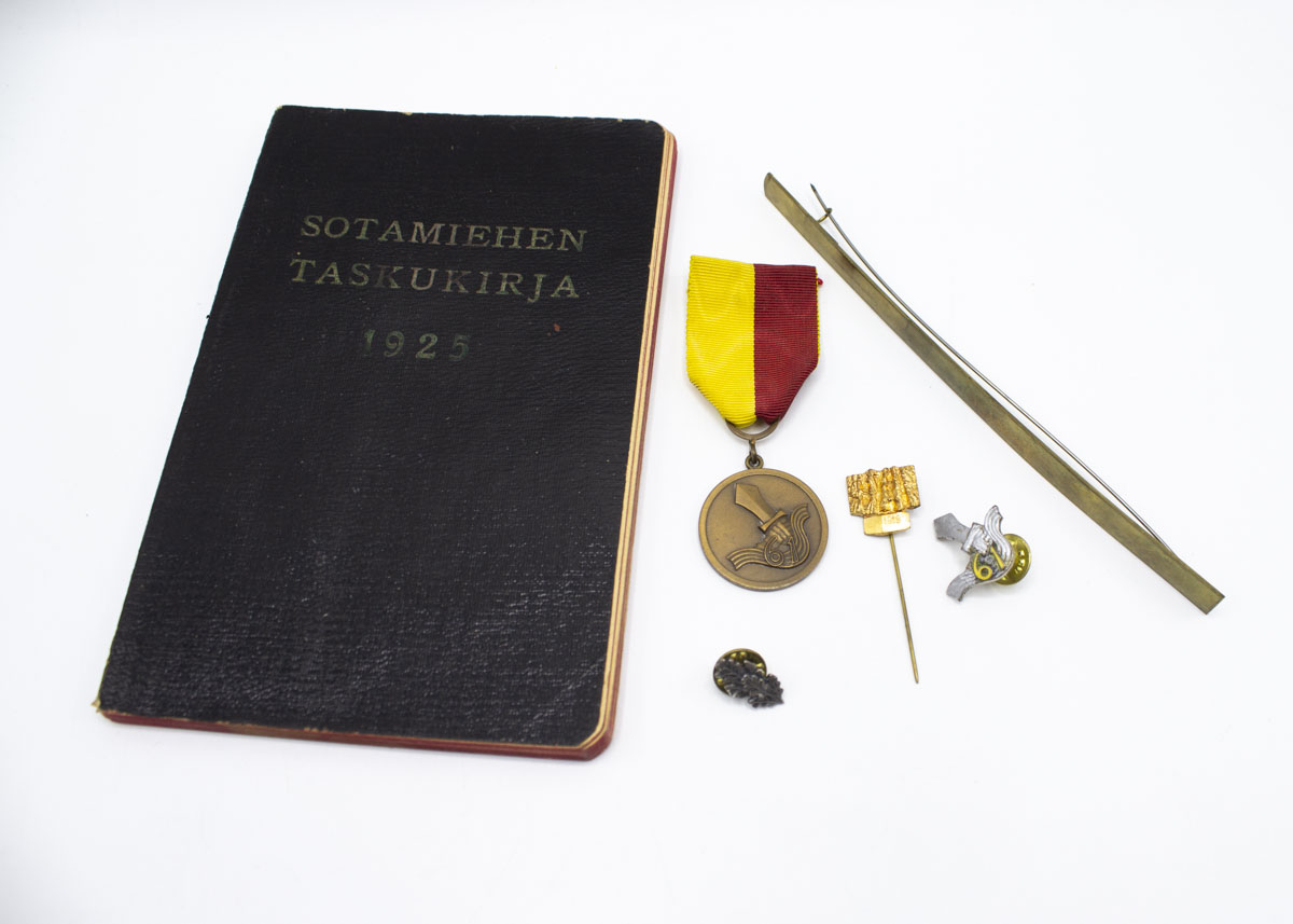270: (16068-6) Jalkaväkirykmentti 61 -mitali, merkkejä, ripa ja sotamiehen taskukirja