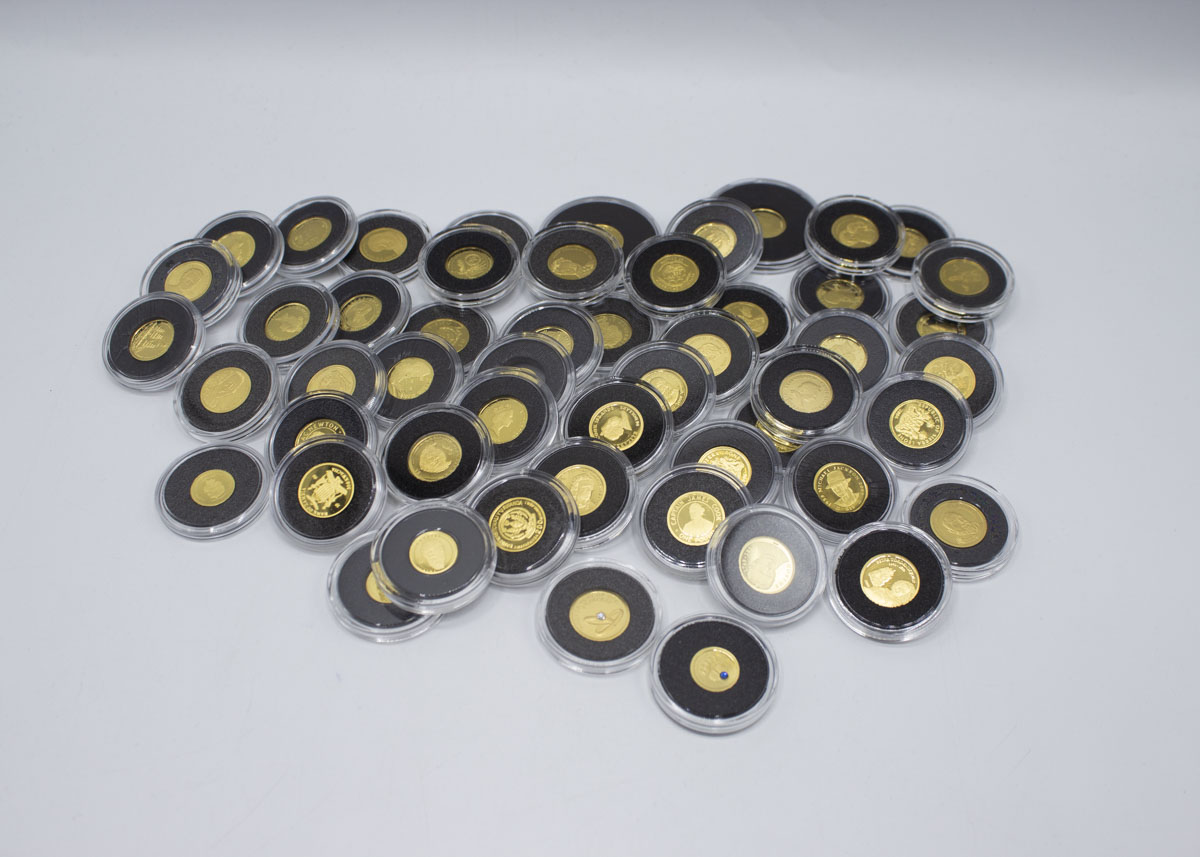 384: (16650-9) Pieniä kultarahoja 52 kpl 60,00g/999, 1,75g/999 br.